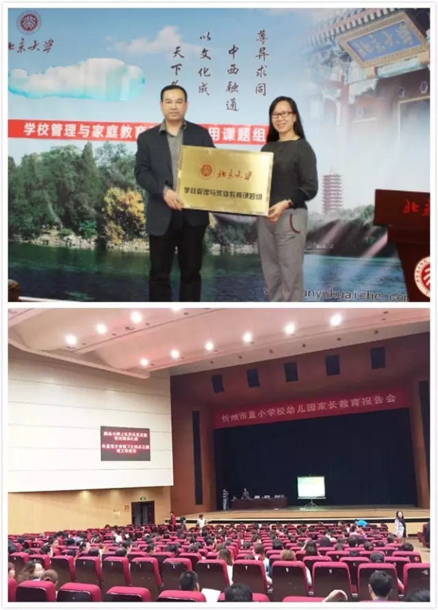 (东方司乐联袂北大成立家庭教育课题组,北大领导尚国芬主任为东方司乐董事长宋振宝授牌;东方司乐定期为家长举办家长课堂)