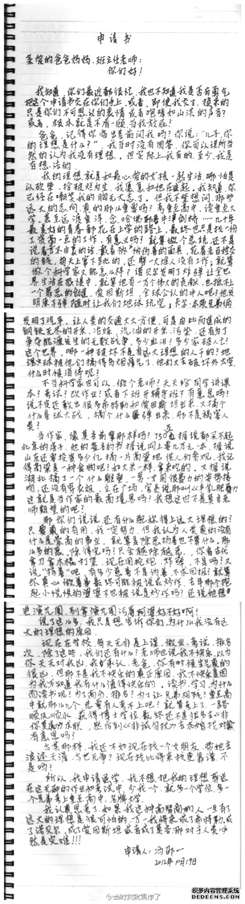 冯邵一的申请书第一页 引发各界关注,专家认为这证明教育制度亟待改革
