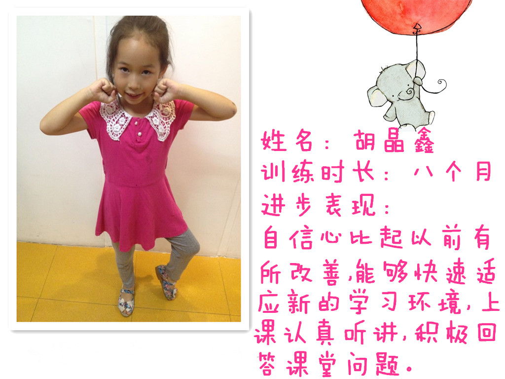 进步表现:自信心比起以前有所改善,能够快速适应新的学习环境,上课认真听进,积极回答课堂问题。
