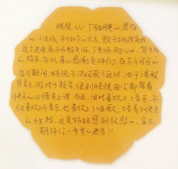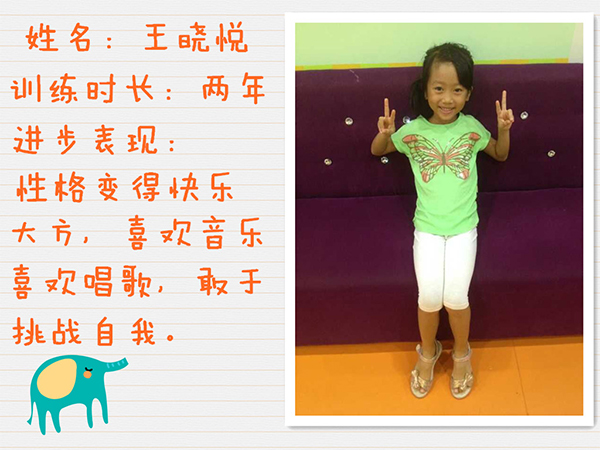 进步表现:性格变得快乐、大方,喜欢音乐、喜欢唱歌,敢于挑战自我。