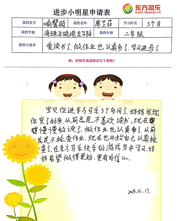 进步表现:爱读书了,做作业也认真了很多,学习有所进步。