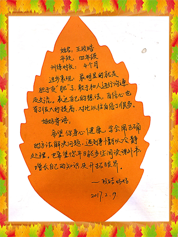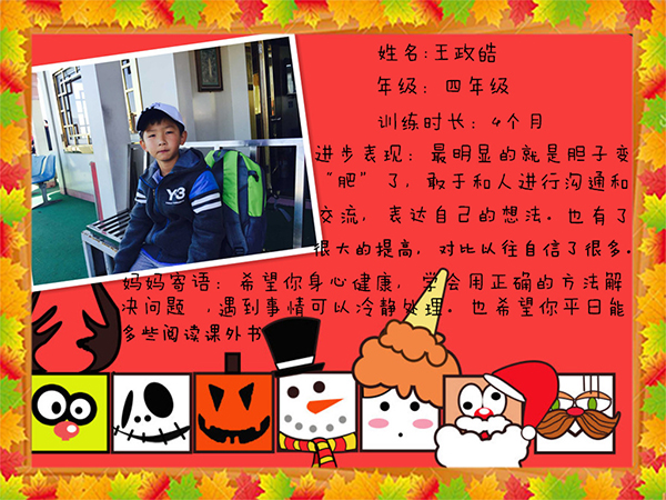 妈妈寄语:希望你身心健康,学会用正确的方法解决问题,遇到事情可以冷静处理,也希望你平日能多些阅读课外书。