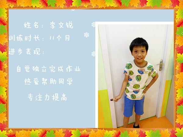 进步表现:自觉独立完成作业,热爱帮助同学,专注力提高。
