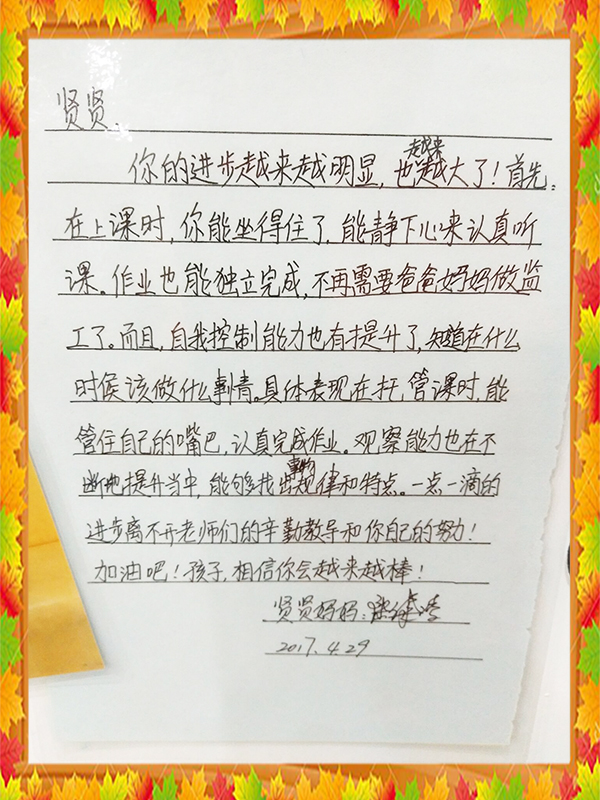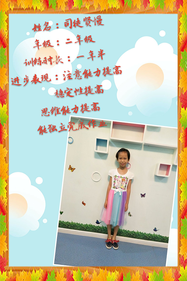 进步表现:注意能力提高,稳定性提高,思维能力提高,能独立完成作业。